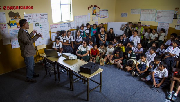 Son un promedio de 60 escolares del nivel primario de la institución educativa Nuestra Señora del Perpetuo Socorro quienes con una sonrisa y en silencio escuchan atentamente la ponencia que empieza describiendo la difícil geografía en donde las antiguas culturas del Perú cultivaron, cazaron y edificaron sus viviendas y centros ceremoniales.