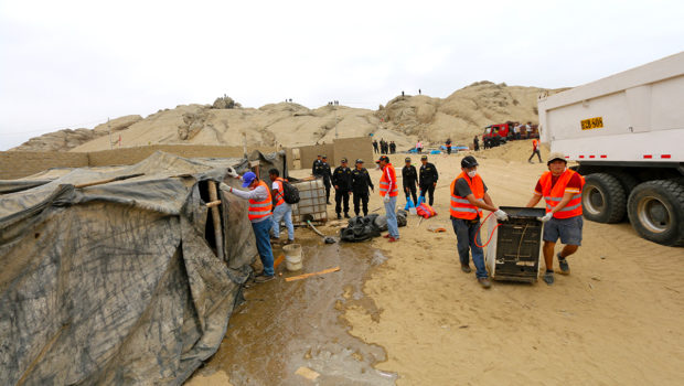 El desalojo se inició pasadas las 11:00 horas y se prolongó hasta las 15:00 horas, fue necesaria la intervención de dos cargadores frontales y un volquete para poder derribar las paredes de adobes y sacar los escombros de los ranchos que habían armado en esta zona arqueológica que forma parte del Patrimonio Cultural de la Nación.